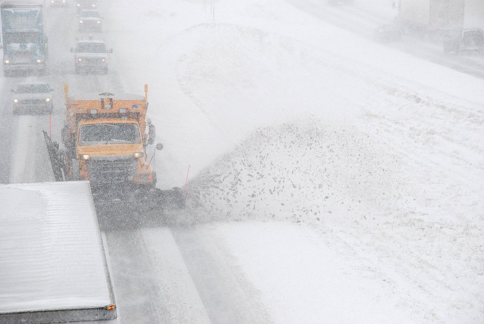 an icy Interstate 80 northeast of Lincoln, NE with heavy snow falling.