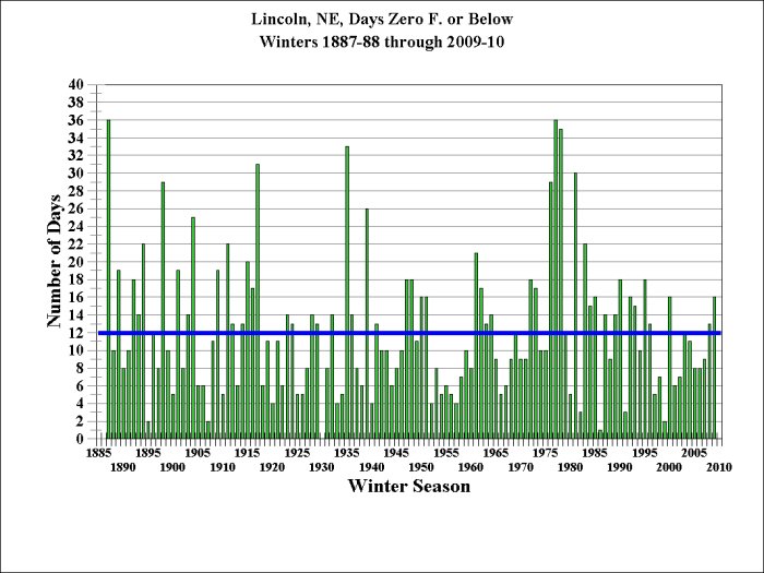 | 3. The coldest recorded 24 hours in Lincoln | 9. Listing of Number of Days, each Winter Season |