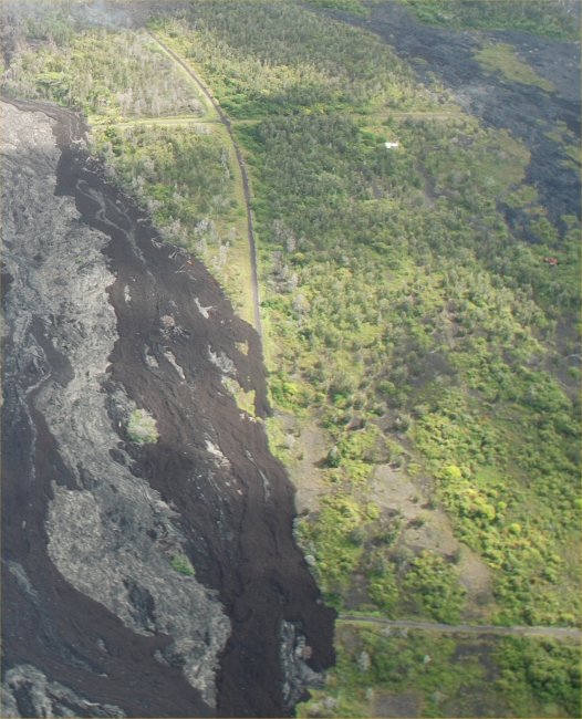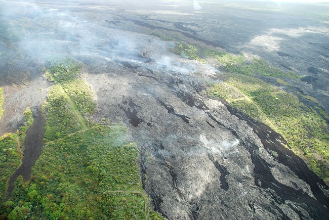 The Pu'u Oo Crater, is off to the left and smoke marks the path of the